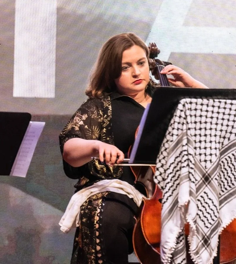 Dr. Aliah Ajamoughli, PhD is a Syrian American ethnomusicologist, cellist and educator. Her musical style intertwines seemingly two opposing worlds: the folk tunes of her fatherland Syria with medleys of her Alabama upbringing. This blending of bluegrass and maqam sounds the necessity of revolution, joy, and hope across global systems of oppression. -